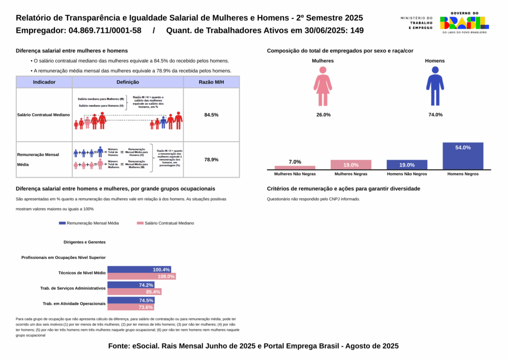 Nosso compromisso com a transparência e a igualdade salarial está refletido neste relatório, que apresenta de forma clara as diferenças de remuneração entre mulheres e homens. Ao divulgar esses dados, reforçamos a importância da equidade, da diversidade e da responsabilidade social na construção de um ambiente de trabalho mais justo e inclusivo.